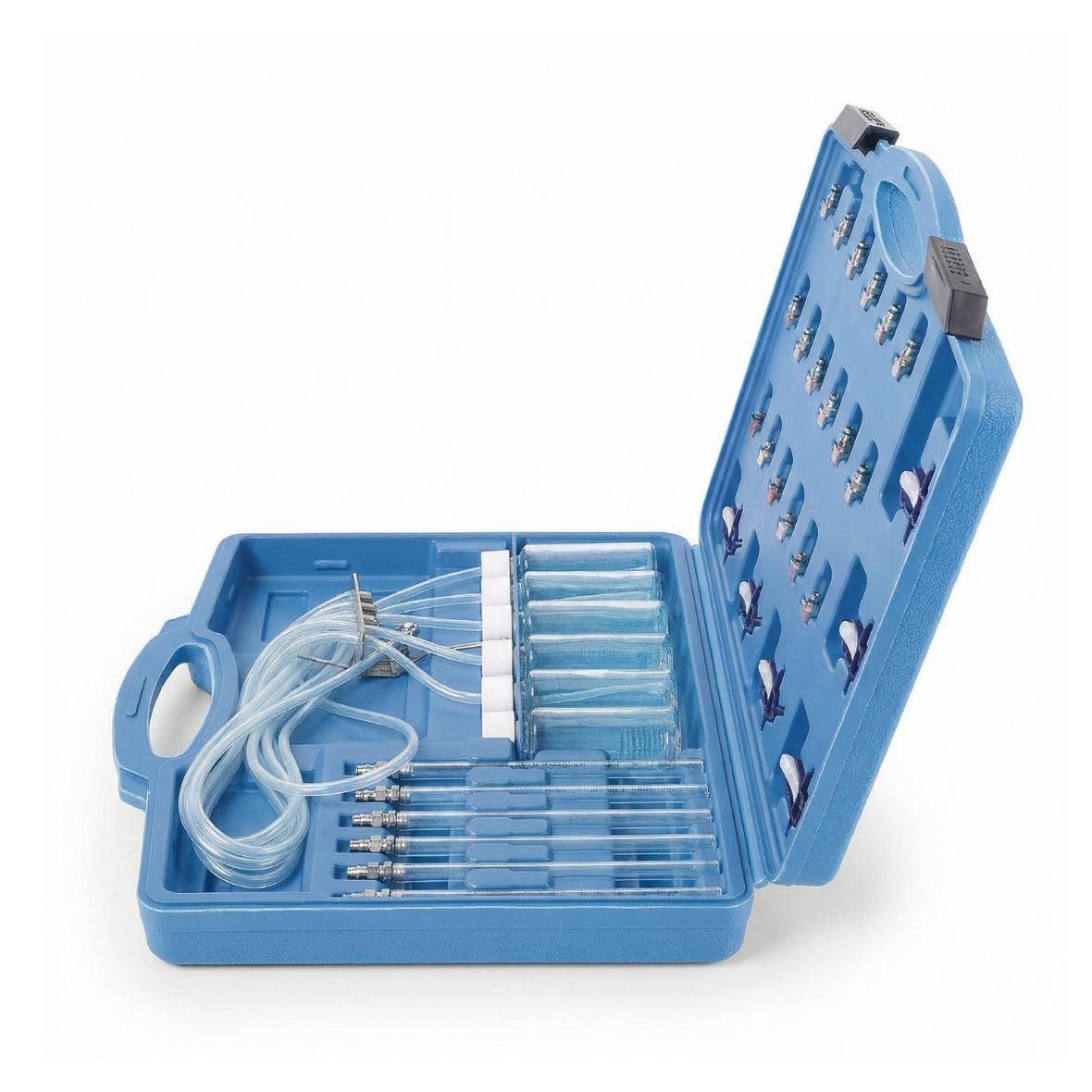 Cada vial tiene una capacidad de 50 ml. La caja incluye tubos de medición, botellas y 24 adaptadores para cubrir una amplia variedad de sistemas de inyección común rail.
