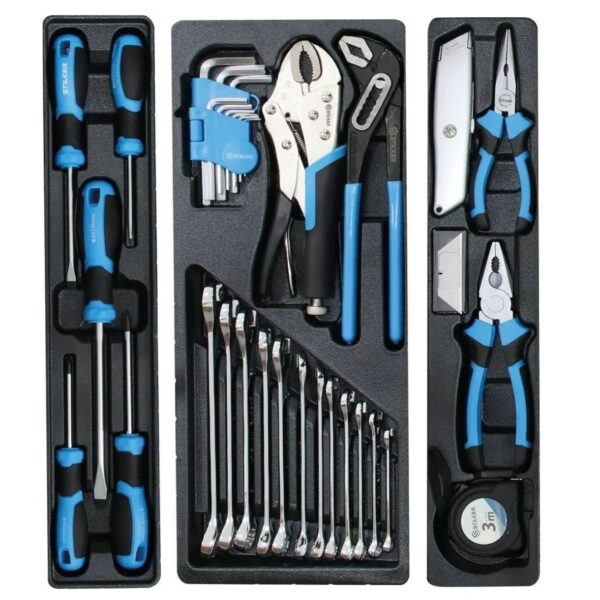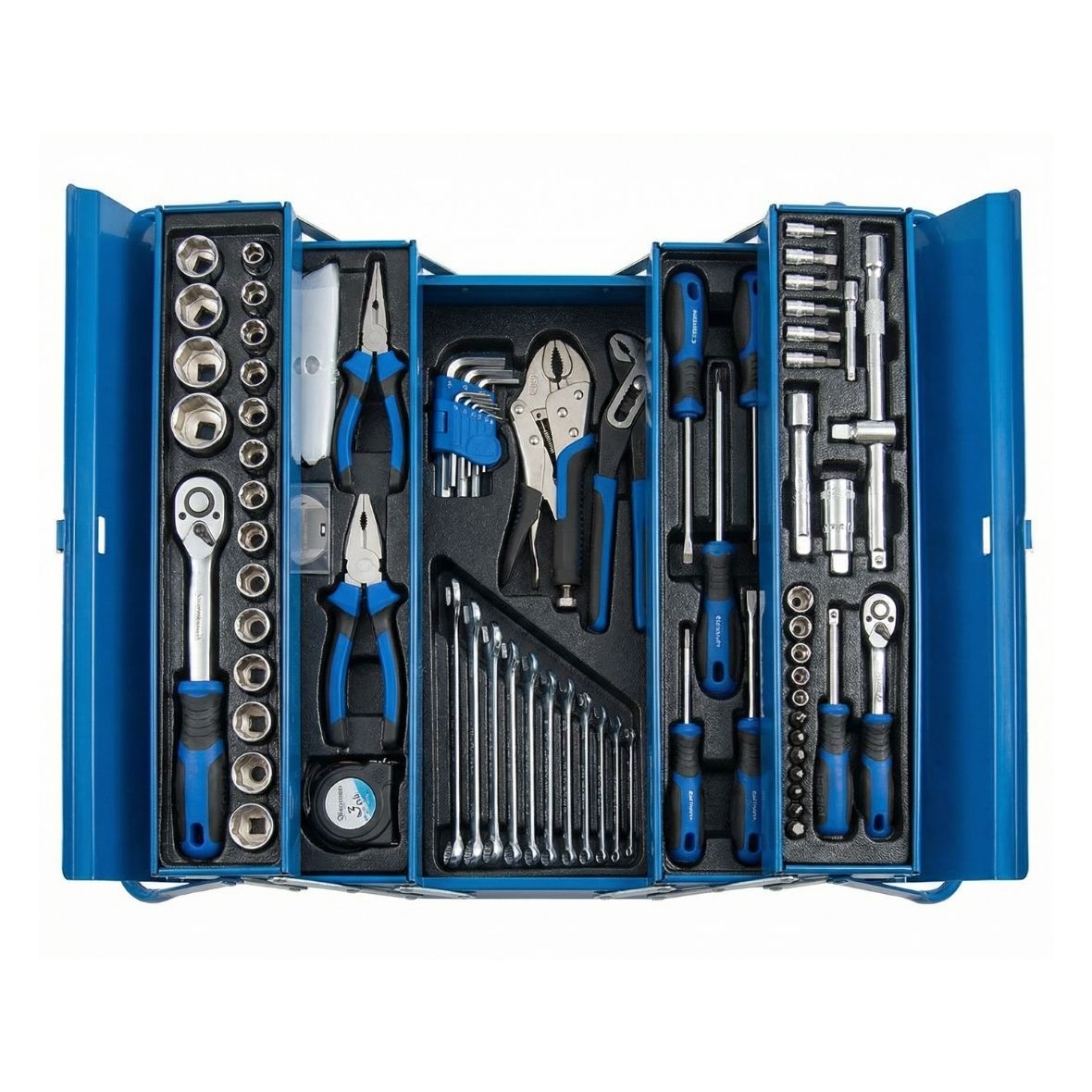 Conjunto de herramientas fabricadas en acero cromo vanadio, diseñado para cubrir tareas habituales de mantenimiento y reparación tanto en automoción como en taller. La selección incluye vasos, llaves, alicates, destornilladores y accesorios esenciales organizados en un estuche resistente y fácil de transportar.