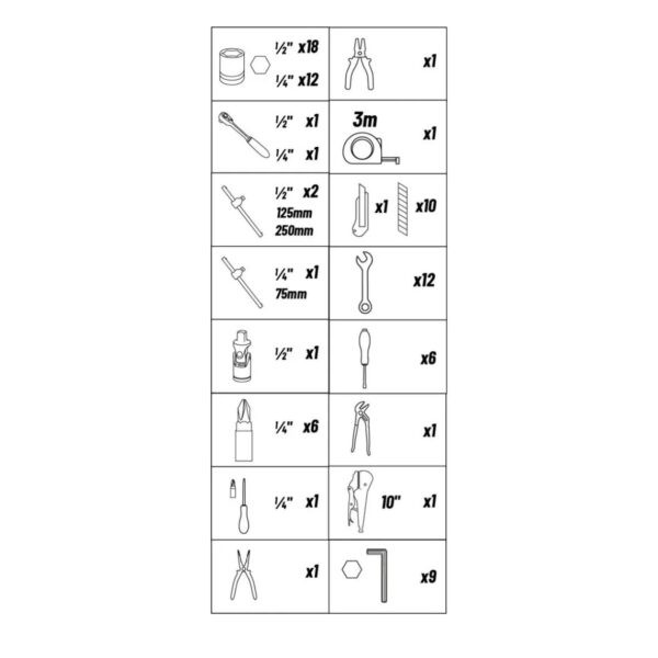 Incluye vasos de 1/2” desde 10 a 32 mm, trinquete de 72 dientes, extensiones deslizantes de 125 y 250 mm, junta universal y un surtido de vasos de 1/4” (4 a 13 mm) con su correspondiente trinquete y extensión. Se incorpora también un destornillador portavasos, alicate de punta fina, abrazadera universal, cinta métrica, cortador con cuchillas, destornilladores planos y Phillips®, abrazadera multiagarre, mordaza de banco, llaves hexagonales de 1,5 a 10 mm y un juego de llaves combinadas de 6 a 19 mm.