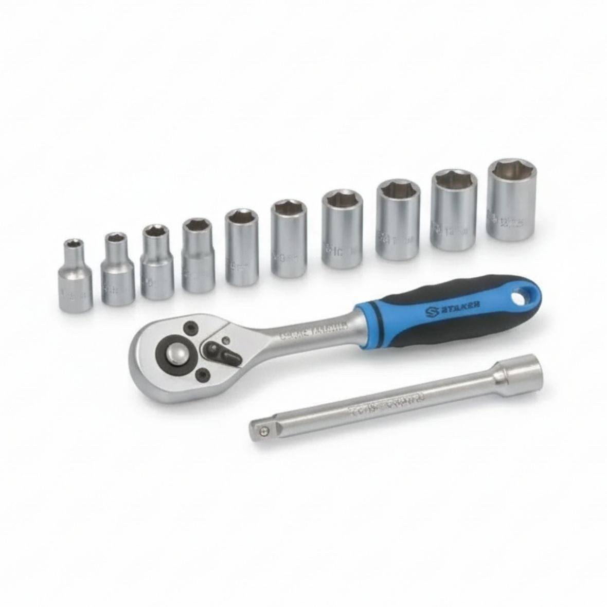Incluye diez vasos de 4 a 13 mm, una extensión de 100 mm y una carraca reversible de 1/4″ con 45 dientes, que permite un movimiento suave y preciso incluso en zonas de acceso limitado.