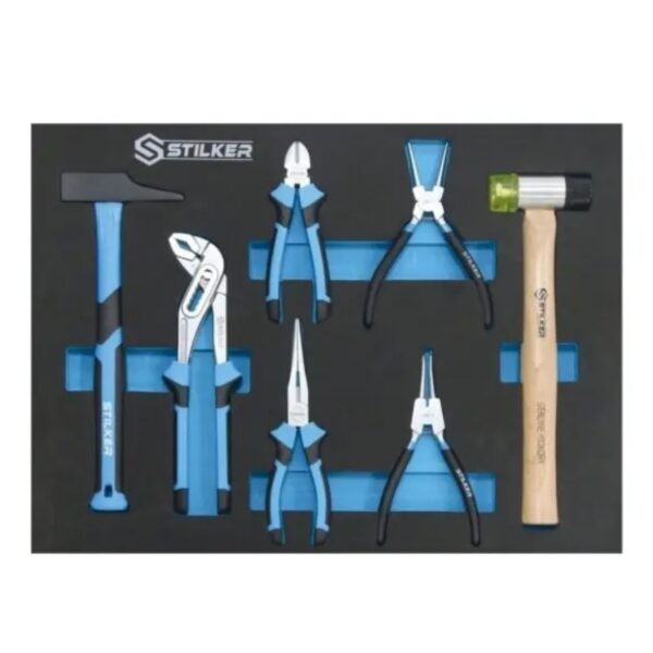 Contiene alicates para anillos interiores y exteriores, alicate multiagarre, alicate de punta redonda, alicate de corte, mazo y martillo remachador.