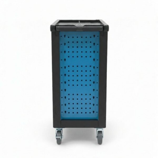 Dispone de ruedas de poliuretano Ø 125 mm (dos fijas y dos giratorias con freno), que facilitan la maniobrabilidad incluso con carga. Con una capacidad máxima de 300 kg, ofrece una distribución equilibrada para herramientas de distinto tamaño.