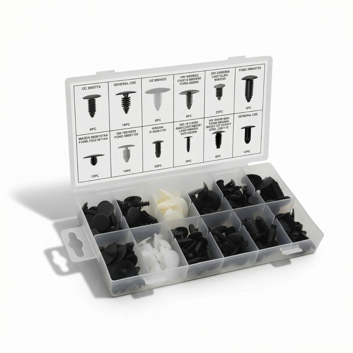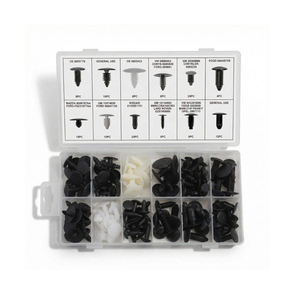 Surtido universal de clips válidos para múltiples marcas, ideal para garajes, talleres y trabajos de carrocería con vehículos de diferentes fabricantes. Organizados por referencia y tipo para un uso rápido y eficaz.