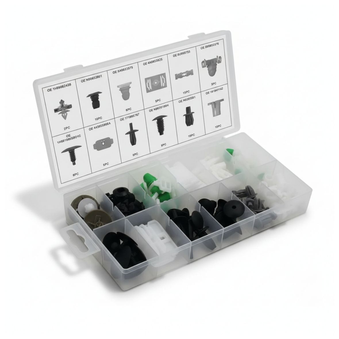 Surtido de clips de fijación para carrocería e interiores de vehículos Volkswagen. Presentados por referencia OEM para garantizar compatibilidad y facilitar la reposición en trabajos de mantenimiento.