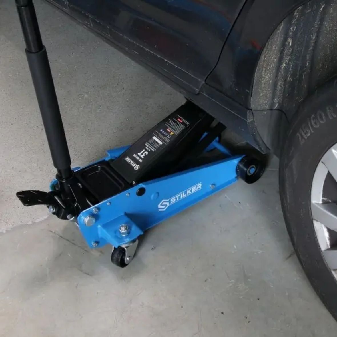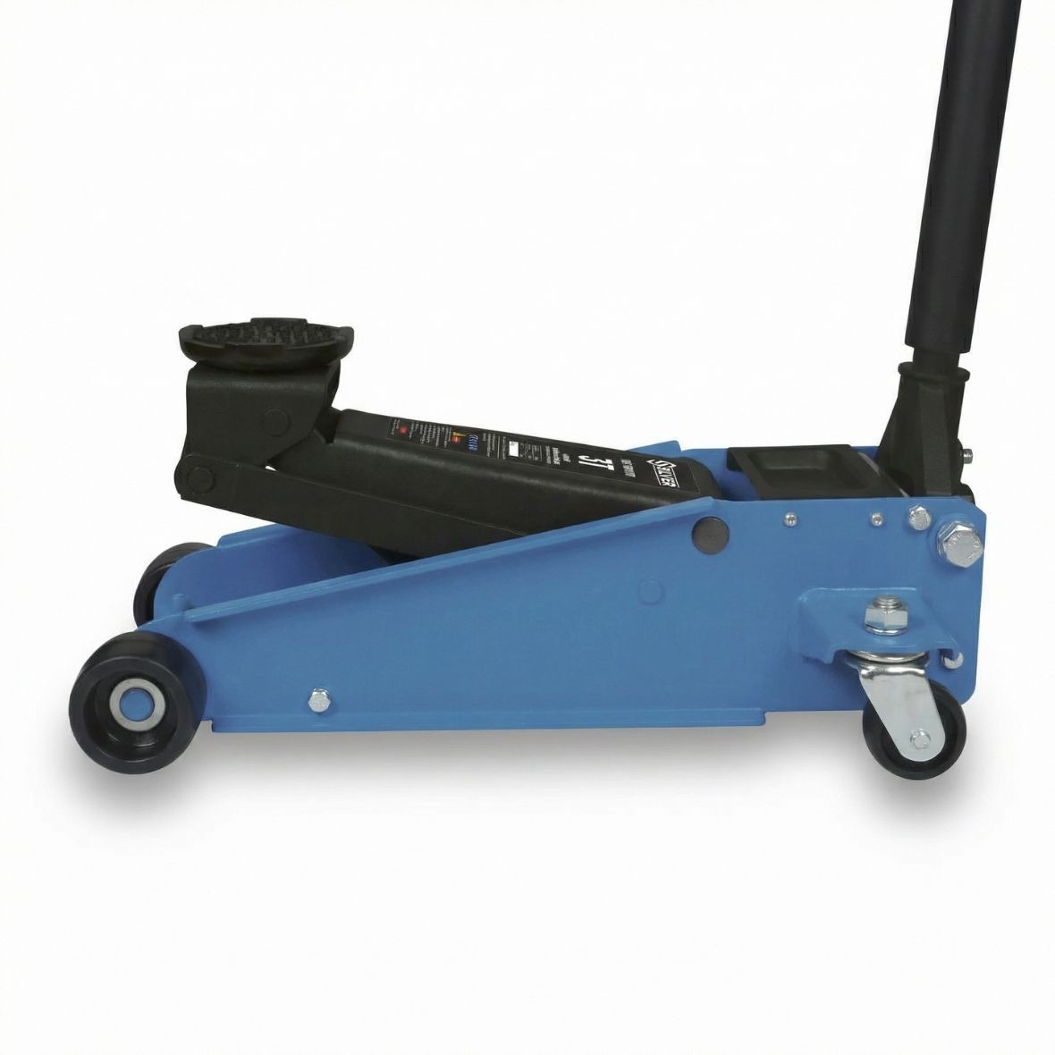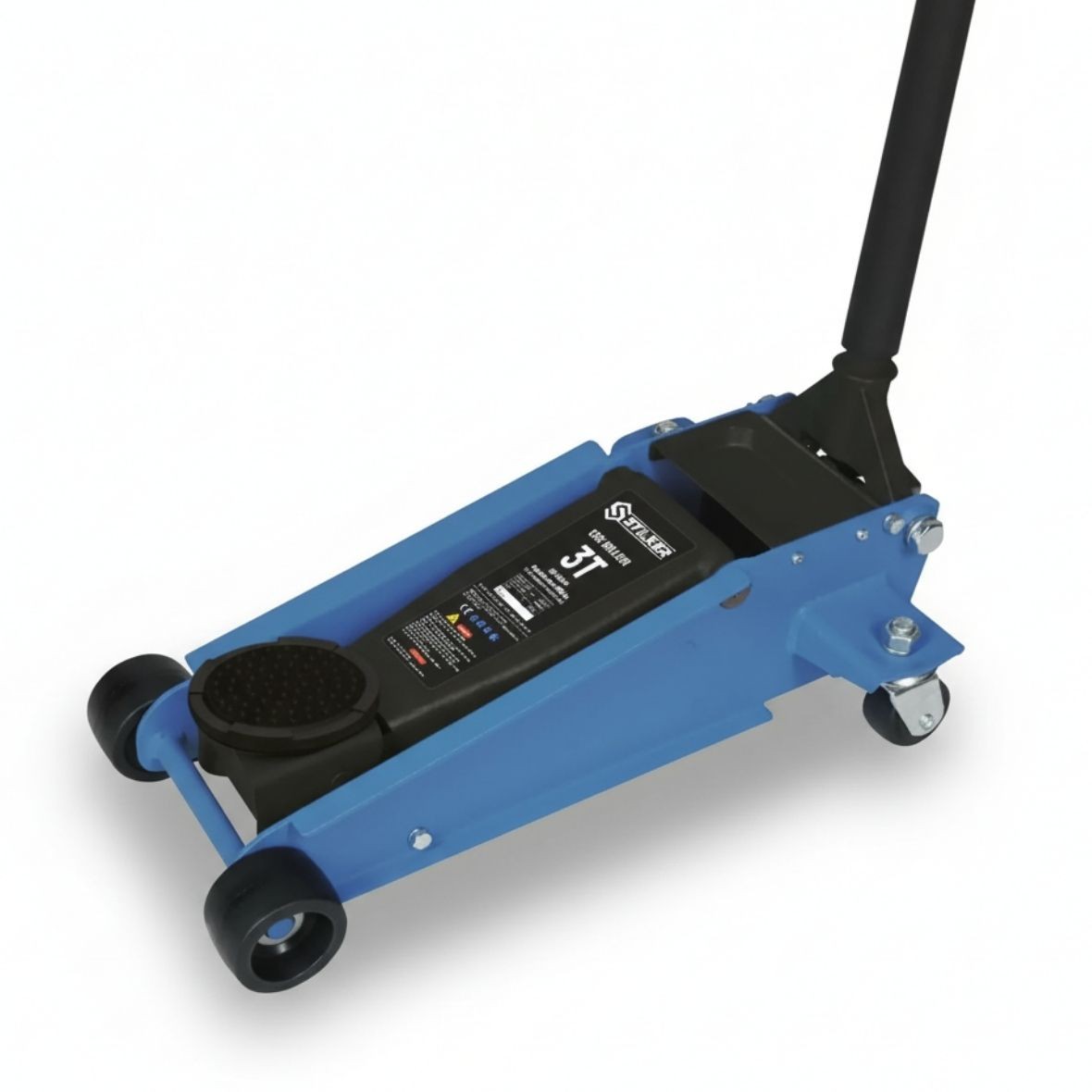 Gato de carretilla de perfil bajo diseñado para elevar vehículos de manera rápida y segura. Su doble pistón permite un ascenso ágil con menos bombeos y su estructura de acero garantiza gran durabilidad en el uso diario.