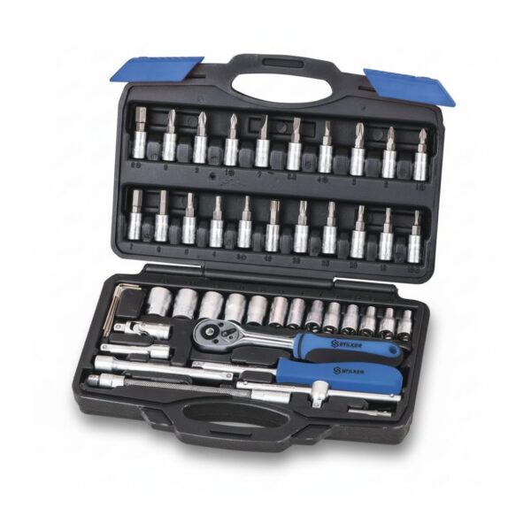 Juego compacto de vasos y accesorios adecuado para trabajos de precisión, pequeñas reparaciones y montaje en espacios reducidos. Fabricado en acero cromo vanadio, garantiza resistencia y larga vida útil.