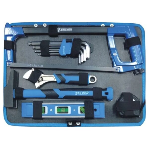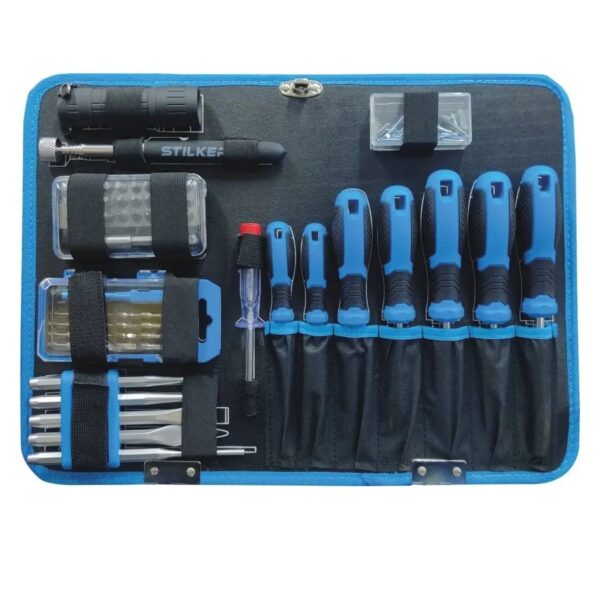 Incluye alicates de punta larga, corte, multiagarre y retención; tijeras, cortador, abrazadera universal, cinceles, recogedor magnético, destornillador de precisión, puntas de precisión y un destornillador de prueba. Se añade un juego de llaves combinadas de 8 a 22 mm, llaves hexagonales, nivel, cinta métrica y sierra de metal.