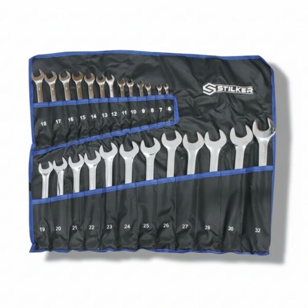 Set completo de llaves combinadas pulidas en cromo brillante, diseñadas para trabajos exigentes en mecánica, mantenimiento e industria. Fabricadas en acero cromo vanadio, ofrecen una gran resistencia al desgaste y una larga vida útil.