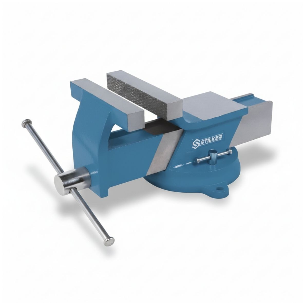 Mordaza profesional diseñada para trabajos de sujeción en banco de trabajo. Su base giratoria de 360° permite ajustar la posición de forma rápida y segura, facilitando tareas de corte, lijado o ensamblado.